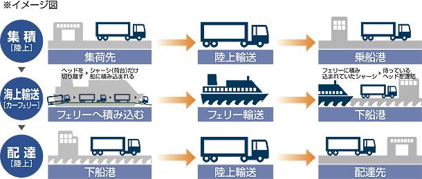 フェリー輸送の定時運航とフェリー専用車両による一貫輸送のため貨物の積替えもなく、貨物へのダメージはほとんどありません。 環境対策の一環(省エネ法の推進) モーダルシフト対応で、CO2の排出削減など環境対策に適っています。 |